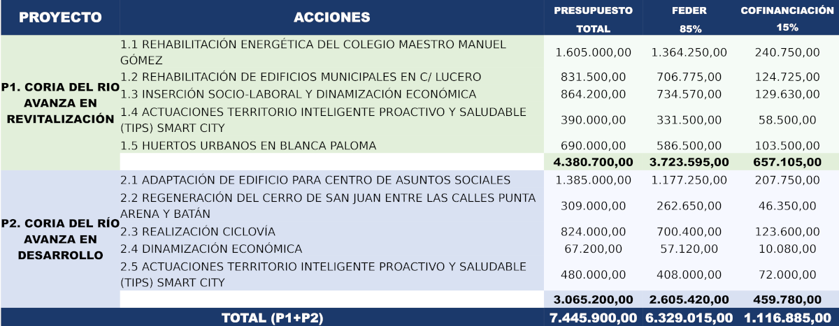 Coria del Río ha sido una de las localidades beneficiarias de EDIL, con inversión total de 7.445.900 €, de los cuales el 85% (6.329.015,00€) está cofinanciado por el Fondo FEDER y el resto (1.116.885,00€) lo aporta el ayuntamiento con fondos propios.